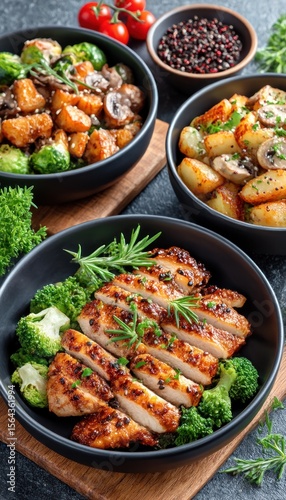 roasted, chicken, vegetable, potato, mushroom, brussels, broccoli, herb, dinner, food, dish, healthy, meal, savoury, cookery, platter, bowl, epicure, appetising, delicious