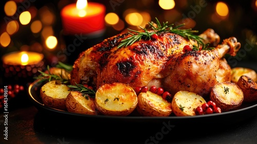 chicken, roasted, potato, dinner, herb, festive, meal, dish, holiday, cookery, food, plate, dark, table, lighting, candle, christmas, seasonal, autumn, spice, rosemary, cranberry, delicious, appetising, deliciously, warm, gold, brown, crispy, cooked, ingredient, celebration, thanksgiving, autumn, hearty, tray, dinnerware, rustic