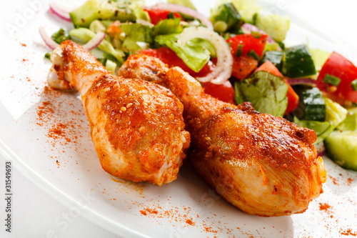chicken, food, dinner, meat, leg, drumstick, leg, grilled, fried, roast, roasted, poultry, vegetable, grill, garnish, calorie, diet, dieting, dining, dish, lunch, menu, salad, broiled, nourishment, healthy, plate, tasty, delicious, vegetable, meal, dinner, white, background, colourful, 2, object, horizontal, nutrient, cucumber, tomatoes, tomatoes, lettuce