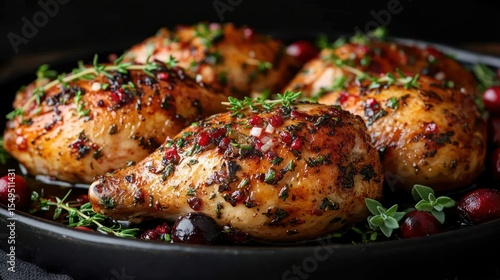 roasted, chicken, herb, cranberry, spice, food, cookery, oven, dinner, dish, meal, flavorful, delicious, juicy, tender, crispy, brown, gold, dark, black, plate, background, garnish, seasoned, cooked, appetising, tasty, edible, protein, healthy, receipe, image, closeup, sharpened, epicure, thanksgiving, christmas, holiday, mealtime, dinnerware