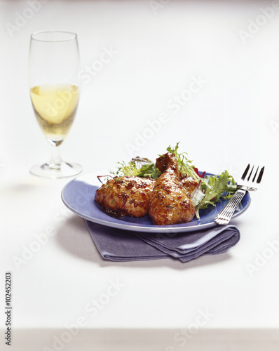 alcohol, bar-b-q, background, bar-b-q, chicken, fork, freshness, glasses, healthy, indoor, indulgence, napkin, nobody, plate, refreshment, roast, served, shadow, still life, vertical, wine, dinner, food, lunch, ready-to-eat, white wine