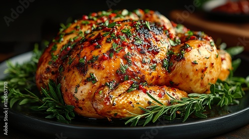 Roasted Chicken with Fresh Herbs on Dark Platter