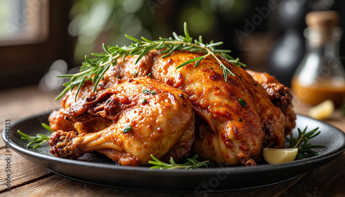 chicken, roasted, rosemary, plate, food, meat, dinner, meal, poultry, herb, cooking, cookery, whole, black, delicious, epicure, homemade, main course, protein, juicy, gold, savoury, appetising, gastronomy, culinary, kitchen, healthy, alimentary, flavorful, aromatic, seasoned, baked, grilled, crispy, tender, succulent, herb, spice, lemon, no people, wooden table, rustic, comfort food, holiday, thanksgiving, christmas, celebration, tradition