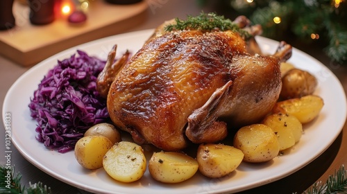Roasted Christmas goose with crispy skin, red cabbage, and potatoes in minimalist style