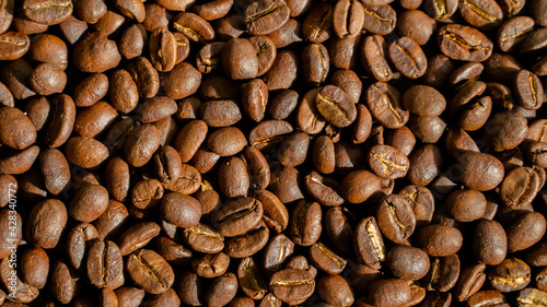 Roasted coffee beans background, arabica beans, top view, texture, close up, seed, Horizontal orientation, copy space