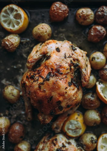 food, chicken, bake, bird, butter, carbohydrate, cook, delicious, dill, dinner, gold, healthy, herb, ingredient, juicy, lemon, meal, meat, olive oil, pan, parsley, protein, roasted, seasoning, deliciously, from above, food photography, potato