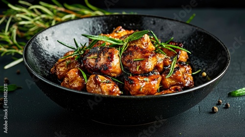food, meat, roast, cube, herb, rosemary, spice, dish, epicure, healthy, protein, delicious, cooked, flavorful, appetising, dinner, meal, cookery, tasty, deliciously, savoury, bar-b-q, grill, plate, bowl, dark, background, eatery, serving, health food, food photography, closeup, image, juicy, tender, aromatic, snack, grilled