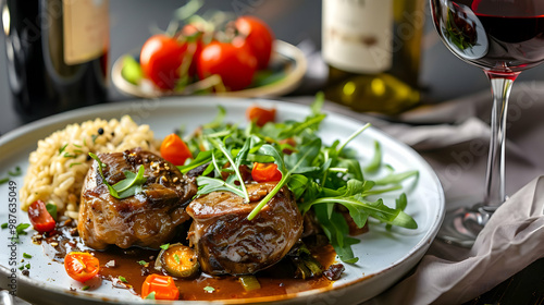 red wine, grilled meat, meat dish, risotto, cherry tomato, gourmet food, food photography, fine dining, culinary arts