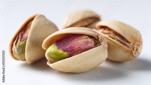 Roasted pistachios displaying rich green and purple kernels, scattered across pristine white surface, highlighting natural color and texture of gourmet nutty treat