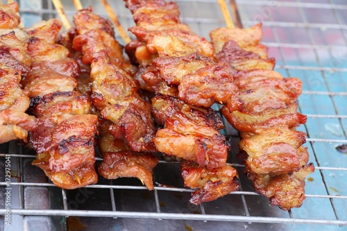 asian, bar-b-q, bar-b-q, closeup, cook, cooking, cookery, delicious, food, grill, grilled, hot, marinated, market, meal, meat, pork meat, preparation, roasted, skewer, street, tasty, thai, traditional