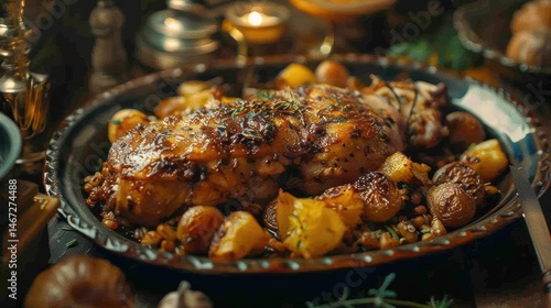 roasted, poultry, potato, herb, dinner, meal, food, oven, delicious, crispy, juicy, seasoning, deliciously, tasty, dinnerware, roasting, appetising, plated, serving, family, holiday, festive, autumn, winter, elegant, epicure, cookery, comfort, receipe, ingredient, spiced, baked, garlic, lemon, vegetable, healthy, rustic, comfort food, thanksgiving, christmas, event, photo, food photography, closeup, gold