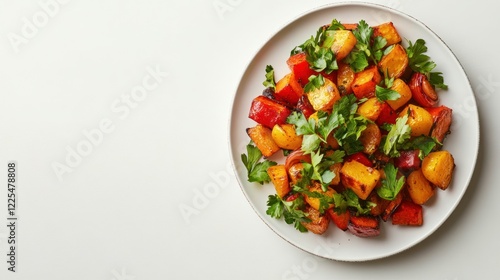 roasted, vegetable, medley, parsley, garnish, pepper, pumpkin, squash, cube, colourful, vibrant, delicious, healthy, food, cookery, dish, plate, white, background, autumn, winter, dinner, lunch, side, vegan, vegetarian, cooking, receipe, tasty, fresh, seasoning, herb, orange, red, yellow, appetising, alimentary, meal, portion, dietary, flavorful, epicure