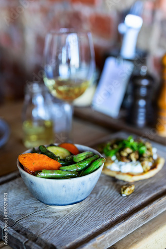 Roasted vegetables with wine pairing on rustic wooden table