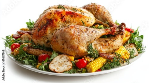 turkey, platter, herb, vegetable, white, background, isolated, food, poultry, cookery, roast, dinner, meal, festive, celebration, holiday, corn, mushroom, tomatoes, parsley, thyme, rosemary, traditional, delicious, gold, crispy, juicy, serving, portion, feast, rustic, whole, cooked, roasted, freshness