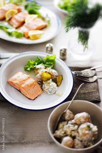 main, wild, lemon, homemade, healthy, epicure, food, fish, fillet, fats, dinner, dill, cutlery, cookery, vertical, table, sustainable, scottish, scandinavian, salmon, salad, roasted, potato salad, potato, platter, plate, pickle, meal, main course, copy space