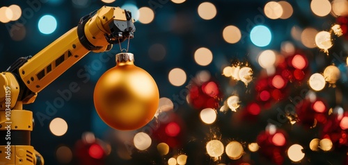Robot arm decorating Christmas tree with golden ornament, blurred festive background.
