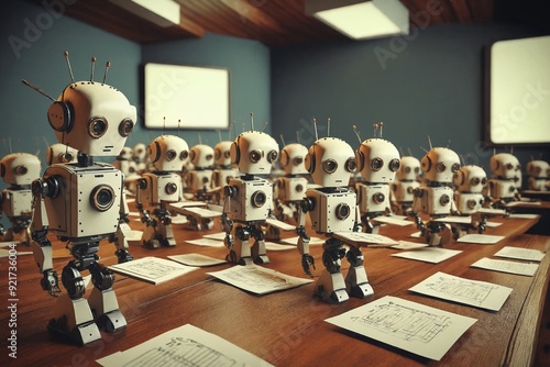 robot, meeting, room, desk, paper, toy, machine, technology, group, sitting, standing, office, business, conference, table, chair, artificial intelligence, automation, futuristic, miniature, assembly, android, electronic, innovation, illustration, interior, furniture, empty, hall, architecture, chair, eatery, design, luxury, indoor, building, contemporary, work, classroom, school, inside, hotel