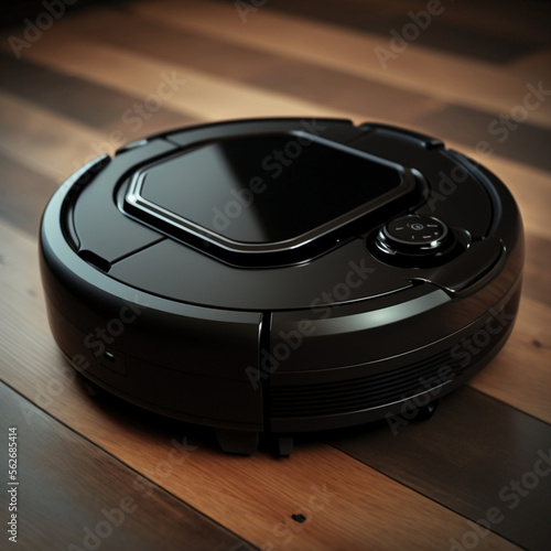 Robot vacuum cleaner cleaning a wood laminate. Generative AI.