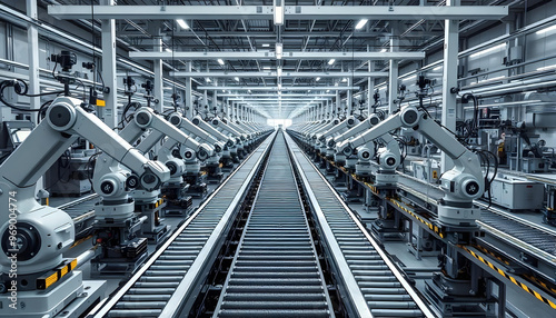 robotic, arm, arm, factory, automation, manufacturing, industrial, machinery, conveyer, belt, assembly, production, technology, modern, steel, metal, futuristic, equipment, robot, line, line, system, process, work, task, efficient, precise, repetitive, innovation, industry, white, grey, black, yellow, overhead, structure, lighting, light, clean, organised, bright, environment, background