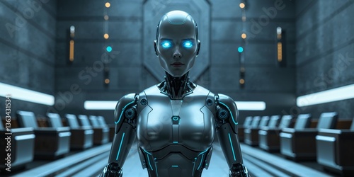 Robotic figure presiding over a courtroom in a futuristic legal setting