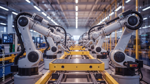 Robots work on an assembly line in a modern manufacturing facility during daytime hours