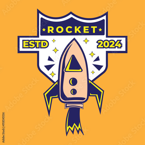 rocket badge illustration vector design with rocket in colorful, simple style and orange background. suitable for logos, icons, posters, advertisements, banners, companies, t-shirt designs, stickers,