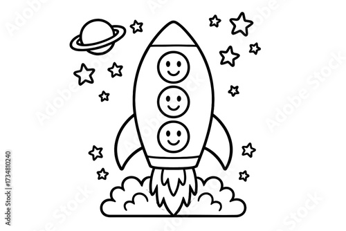 rocket, off, transportation, colouring, page, blasting, into, space, star, planet, up high, smiling, window, black, white, vector, line, art, bold, outline, cartoon, style, isolated, transparent, background
