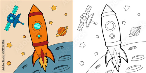 Rocket in space suitable for children's coloring page vector illustration