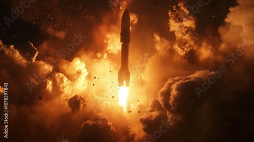 Rocket launch captured at the moment of ignition, fiery exhaust and heavy smoke filling the background