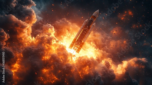 rocket, launch, space, fire, flames, explosion, cloud, smoke, debris, astronomy, science, technology, innovation, future, energy, power, space-travel, vector, graphic, digital artwork, illustration, orange, yellow, dark, light, powerful, ascending, thrust, engine, universe, cosmos, isolated, modern, contemporary, digital, abstract, design, art, creative, nebula, sky, gas, texture, fantasy, night