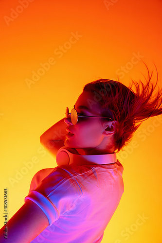 Rocking. Caucasian woman's portrait on orange studio background in red-pink neon light. Beautiful female model in sunglasses and device. Concept of human emotions, facial expression, sales, ad