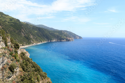 Rocky coast and Cinque Terre village Manarola and Mediterranean Sea, Italy