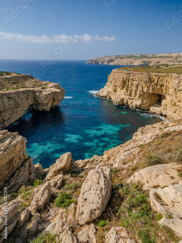 Rocky coast on a sunny day along Gozo Island, Malta.1