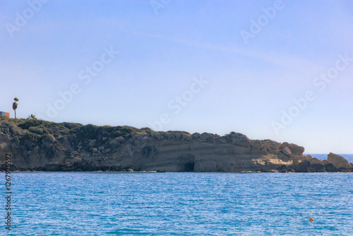 Rocky coastal cliffs with a sea cave under clear blue sky, Paphos, Cyprus, 23.11.2024