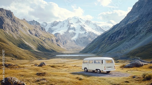 Rocky Mountain Road Trip:Vintage Campervan Adventure,Minimalist Travel.Concept of minimalist travel, road trip, adventure, scenic landscape, vintage aesthetics, sustainable touris