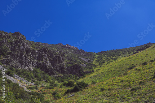 mountain, landscape, nature, summer, view, sky, scenic, gorge, vale, green, blue, scenery, rock, hill, canyon, kazakhstan, highland