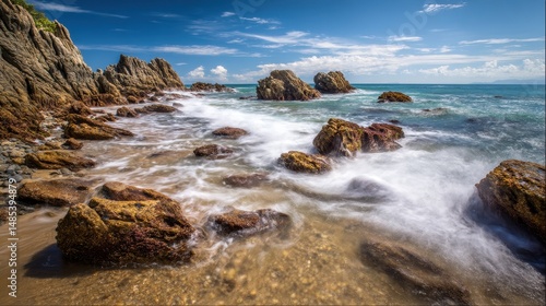 shoreline, wave, rock, beach, ocean, water, coast, sea, foam, rocky, brown, gold, sand, blue, sky, cloud, daylight, sunlight, nature, landscape, summer, beautiful, scenic, view, tranquil, calm, powerful, motion, clear, detail, photo, travel, vacation, relaxation, coastal, natural, exterior, photo, image, viewpoint, stunning, gold, exposure, dramatic