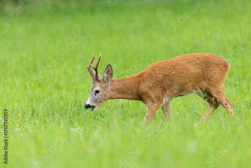 Roe deer buck grazing on the fresh grass after the storm. Roe buck during mating season in a natural meadow. Wildlife. Capreolus capreolus, Slovakia.