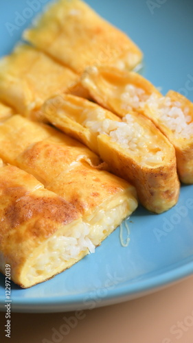 roll omelette stuffed with chesse and rice on blue plate, delicious food in the morning