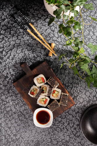 Roll with vegetables and fish paste with a sesame cap. Sushi menu bar. Japanese food Sushi served top view.