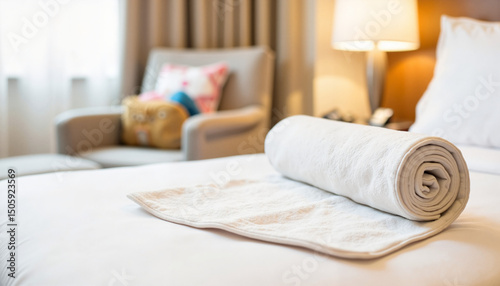 towel, rolled, bed, hotel, cosy, room, lighting, comfort, relaxation, interior, decor, hospitality, soft, clean, organised, detail, peaceful, atmosphere, setup, aesthetic, plush, furniture, inviting, essential, sleep, ambience, personal, touch, textile, interior design, warm, serene, service, leisure