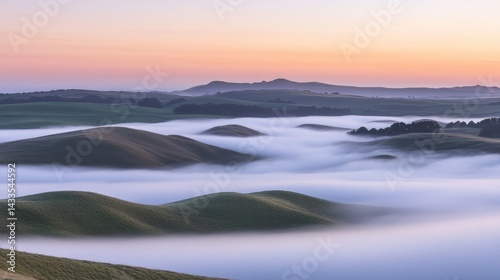 landscape, fog, mist, sunrise, sunset, hill, rolling, sky, nature, dawn, morning, evening, atmosphere, calm, tranquil, serene, light, aethereal, peaceful, rural, outdoors, gradient, green, blue, orange, pink, view, perspective, distance, field, vale, horizon, subtile, soft, texture, layer, beauty, scenic, natural, land, earth, cloud, covered, below, up high, hazy, dreamy, distant