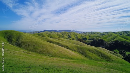 Rolling green hills, sunny day, coastal view, pastoral landscape, travel brochure