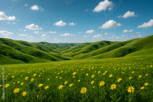 Rolling green hills under a bright blue sky, dotted with yellow wildflowers, cinematic wide-angle view, ultra-realistic