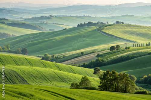 Rolling green hills under soft sunlight, idyllic countryside view