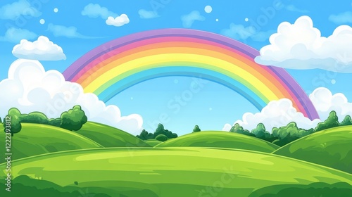 Rolling green hills with a bright rainbow spanning the horizon under a picturesque blue sky with fluffy white clouds