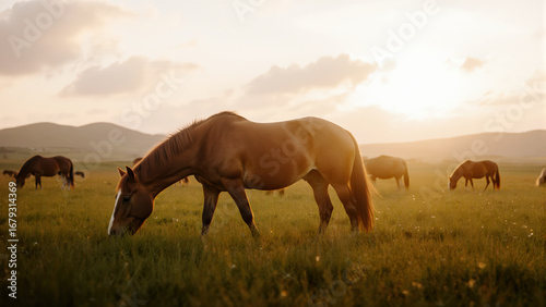 horse, chestnut, sleek, coat, grazing, lush, greenfield, huge, soft, golden light, sunset, peaceful, rolling hills, cloudy sky, serene, tranquil, nature, outdoors, rural, countryside, equestrian, majestic, beautiful, animal, wild, farm, golden hour, light, landscape, meadow, field, calm, animal kingdom, farm animal