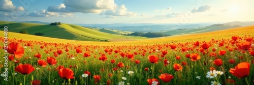 Rolling hills, poppy field ablaze with wildflowers, gentle breeze , botany, tranquil