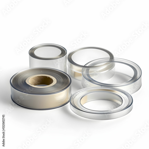 Rolls of transparent adhesive sticky tape in various widths and lengths, isolated on a white background