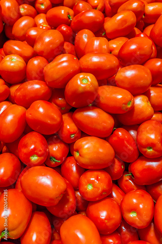 agriculture, background, bright, brightly lit, concept, freshness, fruit, full frame, heap, horizontal, market, no people, organic, outdoors, photo, plum tomato, red, shiny, stack, textured, tomatoes, vegetable, vibrant color